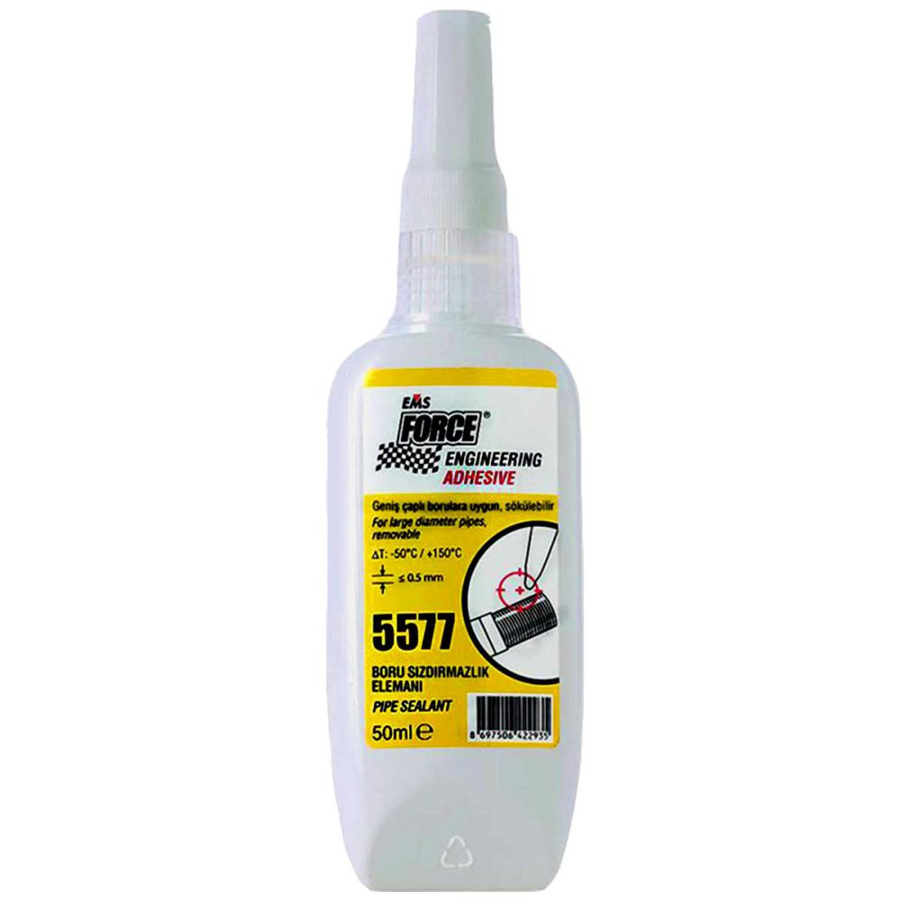 آببند لوله و اتصالات تفلون مایع فورس EMS FORCE 5577 محصولی از برند EMS FORCE و ساخت کشور ترکیه است. این محصول شباهتی به چسبهای قطرهای دارد و برای آببند لوله و اتصالات فلزی استفاده میشود. این محصول در برابر مواد شیمیایی بسیار مقاوم و فاقد بوی اسیدی است. از تفلون مایع فورس 5577 بدون آچا در لولهکشی میتوان استفاده کرد.