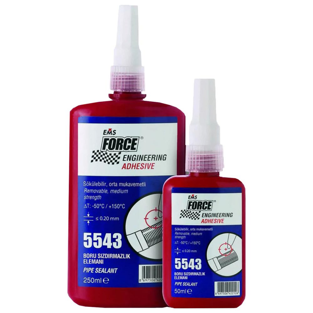 آببند لوله و اتصالات تفلون مایع فورس EMS 5543 غلظت بسیار بالایی دارد؛ به رنگ آبی است و همچنین قابلیت مصرف مجدد دارد. استفاده از این محصول بسیار آسان و سریع بوده و این امر سبب تغییر فرمول شیمیایی آب نمیشود. تفلون مایع فورس ۵۵۴۳ برای همهٔ سیالات مناسب است؛ ولی به طور معمول در لولهکشیهایی که وظیفه انتقال مواد شیمیایی و روغن را بر عهده دارند استفاده میشود.